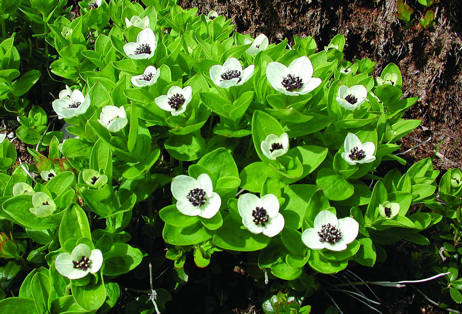 Саженцы канадского дерена образуют эффектные ковры, плотно покрывая почву зеленой листвой. Во время интенсивного цветения карликовые кустарники выпускают множество белых цветов, которые затем становятся красными неядовитыми ягодами. Используется в качестве почвопокровного растения. Особенности крупномера канадского дерена: