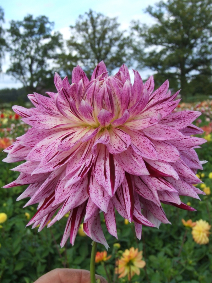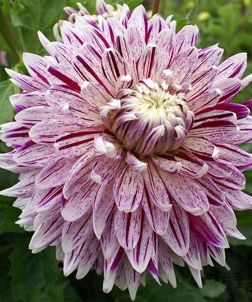 Луковицы георгины Avignon — это сорт, который хорошо смотрится в саду, в одиночных или групповых посадках. Такие растения прекрасно подходят для создания букетов. Кусты прямостоячие с прочными стеблями. Культура цветет продолжительно: с середины июля до первых заморозков. Высота кустарника составляет 90-120 см, а ширина варьируется от 45 см до 60 см. Соцветия-корзинки очень эффектно смотрятся на фоне насыщенно-зеленой листвы. Лепестки окрашены мазками белого, фиолетового, винного и лимонного цветов. Диаметр шапок достигает до 25 см.