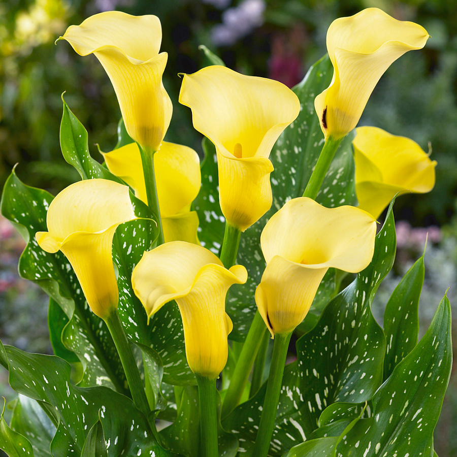 Луковицы Каллы гибридной Блек Меджик (Black Magic Calla) выпускают цветоносы с необычными цветками. По виду они такие же, как и большинство соцветий калл. Ярко-желтый початок укутан зеленовато-желтым покрывалом. Но нижняя внутренняя часть «бокала» окрашена в темно-коричневый цвет. Стреловидные листья крупные и блестящие. Они темно-зеленого цвета, покрыты серебристыми большими вкраплениями. Соцветие держится на кусте в течение 1,5 месяцев. В срезке оно простоит в первозданном виде 5–7 дней. Срезать соцветия необходимо до образования семян, тогда луковица успевает запастись питательными веществами перед зимовкой.