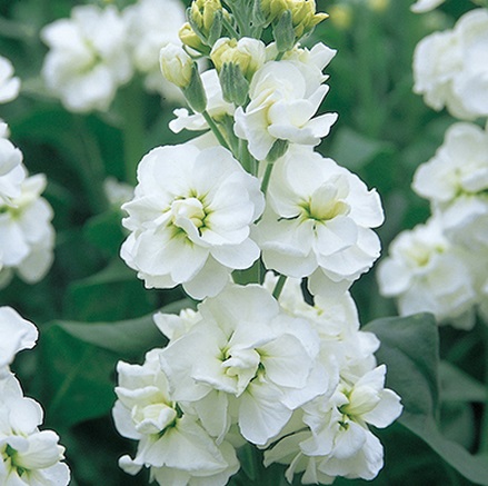 Семена левкоя (маттиолы) Седой Гигант Белый идеально подходят, чтобы выращивать качественный материал для составления праздничных букетов. Крупные махровые цветы с белоснежными лепестками собраны в вытянутые соцветия, которые гармонично смотрятся на фоне зелени листвы.