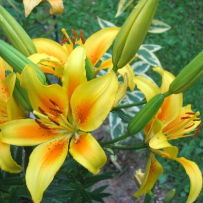 Высота стебля достигает 90 см. Цветет эта лилия в конце июня и начале июля. Цветок кремово-желтый с яркими оранжевыми акцентами ближе к центру и небольшим крапом. Этот сорт предпочитает солнечные места и выносит небольшое затенение. Лилии Тату отлично смотрятся в групповых посадках и букетах, а также подходят для выгонки.