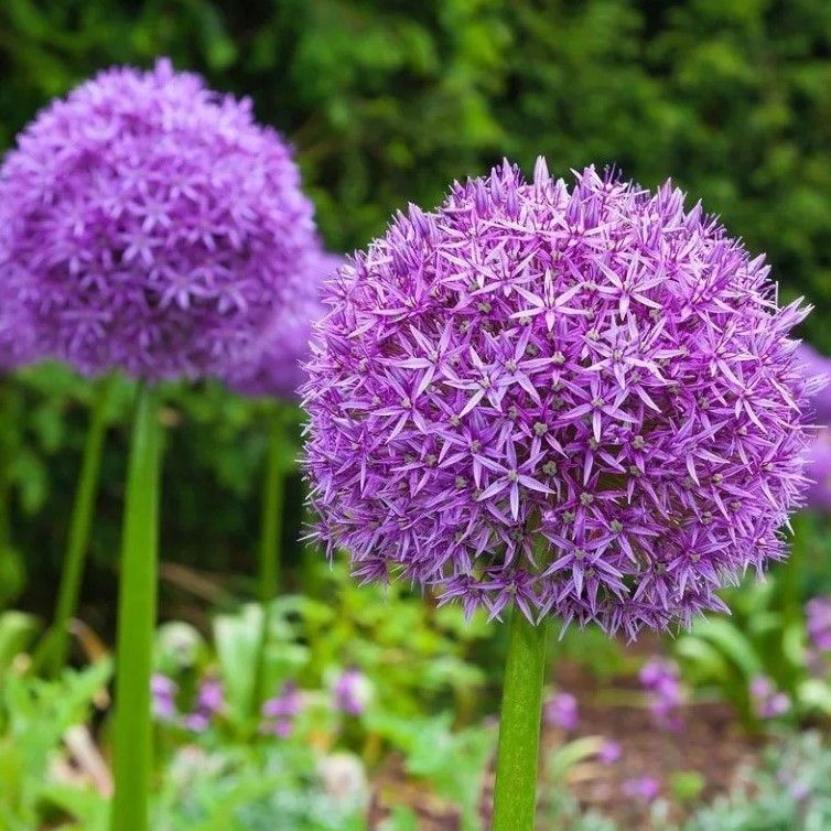 Луковицы лука декоративного гигантского (Allium, Giganteum) достигает высоты 120-150 сантиметров, виден из любого участка сада. Огромные шары, сформированные из мелких фиолетовых цветочков украсят любую открытую территорию — патио, газон, миксбордер. «Шары», диаметр которых превышает 20 сантиметров, размещены на высоких, плотных цветоносах, напоминающих стрелы лука. Идеальны для среза и создания цветочных композиций. Цветет однократно в мае-июне, гармонируя с другими многолетниками. Культура предпочитает солнечные безветренные участки. Ценится за высокую декоративность, морозостойкость.
