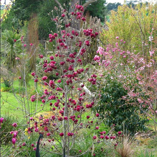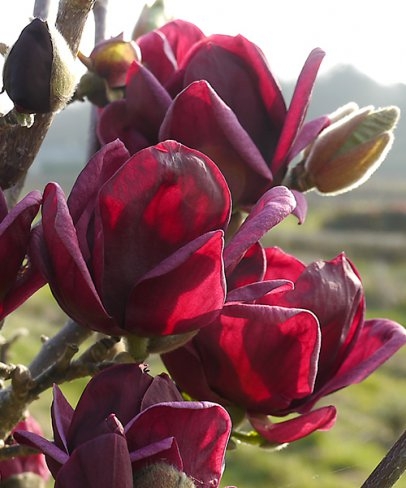 Бутоны имеют черно-красный цвет и напоминают по форме тюльпаны. Постепенно раскрывая лепестки, цветы достигают 15 сантиметров в диаметре. Этот вид магнолии хорошо подойдёт для маленьких садов, но отлично будут смотреться и на большой площади.