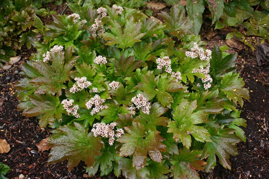 Рассада мукдении росса некрупная, формирует аккуратный кустик около 40 см в диаметре из очень красивых глубоко вырезанных рельефных листьев на крепких коротких черешках. На зиму не сохраняет. Они по форме напоминают листья клена ложнозибольдова. Цветет мукдения в мае, в это время листья еще не достигают конечного размера. Рассаде мукдении росса надо предоставить место в рассеянной тени, на влагоемкой рыхлой достаточно питательной почве. Растение не любит пересушку грунта, но и при застойном переувлажнении страдает – участок должен быть хорошо дренирован.